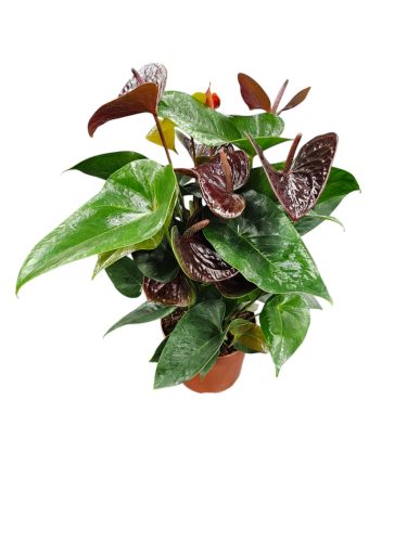 Ez a különleges Anthurium fajta a trópusok melegségét és egzotikumát hozza otthonába. A bőrszerű, fényes levelek kontrasztot alkotnak a selymes, barna virágokkal, amelyek hónapokig díszítik a növényt.