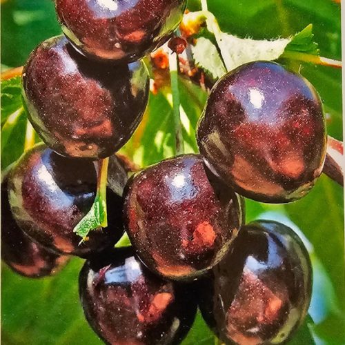 Gyümölcs: középnagy, középnagy, alakja széles, lapított csonka kúp, héja sötét lilásbordó, húsa bordópiros, félemény, bőlevelű, erősen festőlevű, jellegzetes zamatú