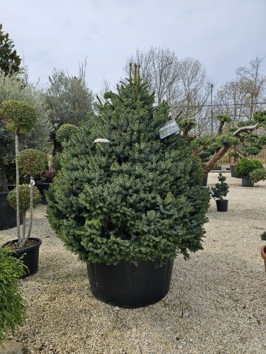 3-4 m magas, fiatalon gömb, később széles kúp alakú fenyő.